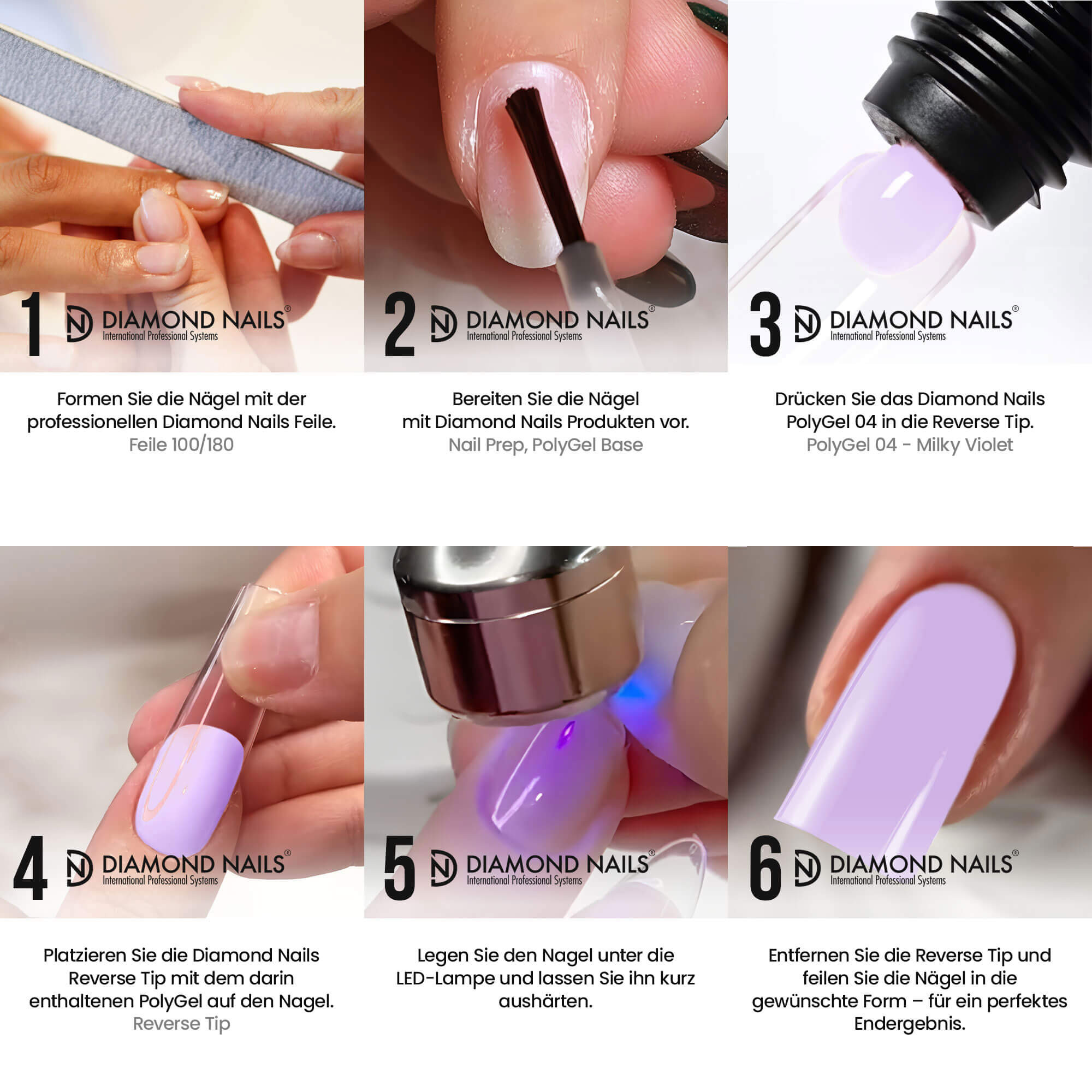 Verwenden Sie den Poly Gel 04 - Milky Violett Reverse Tip, um schnell und einfach schöne milchig-violett Nägel mit einem natürlichen Look zu kreieren.